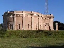 Waverley Reservoir (Elevated) is a reinforced concrete reservoir, with ornate and decorative sides. It is constructed over the roof of Waverley Reservoir No. 2, with the roof support columns of the covered reservoir also supporting the sides and base of the elevated reservoir. Both reservoirs were built together in an integrated and innovative fashion. The elevated reservoir has an unusual feature, namely an attached rectangular antechamber or valve house, with its exterior walls decorated in a similar fashion to the circular reservoir. The decorative features include pilasters framing panels with blocked and arched false windows. Above the entrance doorway is a shield with gothic script, Sanitas est vita, and above that the following inscription "ERECTED / BY THE / METROPOLITAN BOARD OF WATER SUPPLY / AND SEWERAGE SYDNEY / 1918 AD".[5]