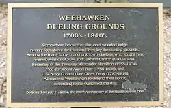 Not far from Deas' was a ledge 11 paces wide and 20 paces long, situated 20 feet (6.1 m) above the Hudson on the Palisades. This ledge, long gone, was the site of 18 documented duels and probably many unrecorded ones in the years 1798–1845. The most famous is the duel between Alexander Hamilton, first Secretary of the Treasury, and Aaron Burr, then Vice President of the United States, which took place on July 11, 1804;[35] this duel was re-enacted on its 200th anniversary (July 11, 2004) by descendants of Hamilton and Burr.[36] Three years earlier, a duel was held at this spot between Hamilton's son, Philip Hamilton, and George Eacker.[37] (Another source, however, puts the duel in Paulus Hook in Jersey City.[38]) Phillip, who had been defending his father's honor, suffered a fatal wound in his hip and his left arm and died two days later on November 24, 1801.[37]