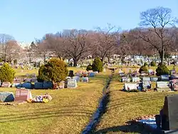 The Weehawken Cemetery, like neighboring Hoboken Cemetery,[1] is not located in its namesake town of Weehawken but rather on the western slope of the Hudson Palisades in North Bergen, New Jersey,[2] with its main entrance on Bergen Turnpike. At its east side the cemetery is overlooked by the Bergen Crest Mausoleum and the Garden State Crematory.[3] and nearby Flower Hill Cemetery.
