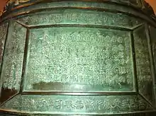 On the top of the Bell, a 2-heads-no-tails dragon appears, with four legs and five toes on each leg. The wall is divided into panels and bands by raised lines and filled with cartouches containing a dedicatory inscription. Around the lower edge, the eight trigrams in a band separated by cloud, and a band of waves runs around the lower edge.[1] Most of the text is from the Sutra of the Names of the 35 Buddhas and the Vinaya Sutra.