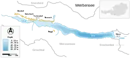 The Weissensee (German spelling: Weißensee) is a lake in the Austrian state of Carinthia within the Gailtal Alps mountain range. The highest situated Carinthian bathing lake shares its name with the municipality of Weissensee on the northern and southern shore.