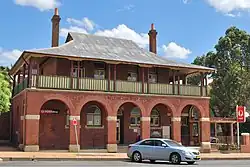 The northern facade is symmetrical, with a two-storey verandah. The ground-floor arcade has five wide arched bays constructed with round header arches supported by painted, rock-faced sandstone imposts and brick piers with painted sandstone bases. It has a concrete floor and steps and boarded soffit painted cream with exposed joists and beams, and shaped cornices. The first-floor verandah has an asphalt lined floor with brown painted, paired timber posts, timber boarded soffit and vertical batten balustrade with fibro backing board painted green and cream. The western side of the first-floor verandah is also partially enclosed with asbestos cement sheet and batten, and glass louvres.[1]