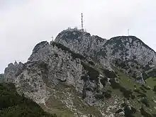 Wendelstein is a 1,838-metre-high (6,030 ft) mountain in the Bavarian Alps in South Germany. It is part of the Mangfall Mountains, the eastern part of the Bavarian Pre-Alps, and is the highest peak in the Wendelstein massif. It lies between the valleys of the Leitzach and Inn and is accessible via the Wendelstein Cable Car and the Wendelstein Rack Railway. On its northern foothills rises the Jenbach, which becomes the Kalten on its way to the River Mangfall. Local valley settlements include Bayrischzell, Brannenburg and Osterhofen.