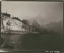Various LSTs managed to move to safety under their own power or with assistance by tugboats. However others were abandoned and allowed to drift, spreading fires, before sinking in the channel. Leaking oil ignited on the water also spread fires to Tares 7 and 9 even though they had been unharmed after the first explosions at Tare 8.[1] Eventually tugboats and foam-carrying salvage ships from Pearl Harbor arrived to fight the spreading fires. One ship managed to turn a drifting LST away from a collision course with an ammunition ship docked across the loch at the ammunition depot.[4]
