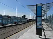 The tram stops are unstaffed raised platforms with two open-fronted cantilever shelters equipped with seats, a 'live' digital display of services, closed circuit television, and an intercom linked to Metro Centre.[21]