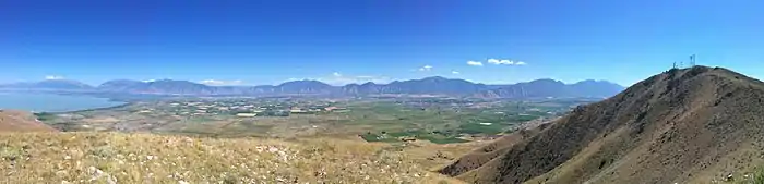 West Mountain's highest point is at 6,912 feet (2,107 m). The radio station tower sits on the second-highest point on the mountain, about 2 miles north of the true summit. The mountain is on the southern segment of the Wasatch Range, though it is not connected to the main range. The mountain is located on the southern shore of Utah Lake.[2]