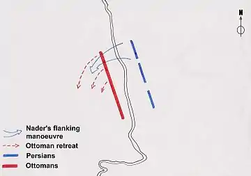 Now Nader faced an adversary who in many respects mirrored the Persian army's own composition in structure as well as constituent unit types. The Turks had drawn themselves up parallel to a stream flowing through the valley, on the other side of which Nader deployed his men into three separate divisions, placing himself in the centre. As the two armies came within musket range of each other, a general fire broke out along the entire length of the line, with the smoke created from the muskets & cannon dancing over the shallow body of water separating the two armies, obscuring the Persians and Ottomans from each other's view. Nader, under this veil of smoke, started strengthening and preparing his right wing for a bold gamble.