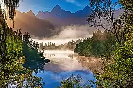 New Zealand comprises two separate islands located in the Southern Hemisphere, commonly referred to as the North Island and the South Island. The Westland forests are located along the central west coast portion of the South Island. South of these forests lay the Fiordland temperate forests. Many glaciers are located in the Westland area. The Southern Alps run along the coast causing orographic lifting and high precipitation.[2]