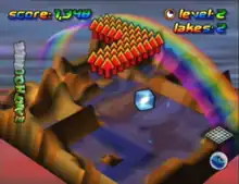 Wetrix is an isometric puzzle video game where the player, on a square landscape, produces mounds to hold water bubbles falling from the sky.[1] Uppers, pieces that raise a part of the landscape that come in the shapes of rectangles, squares, and T-shapes, create walls for the lakes, while Downers do the opposite.[2][3] If there is no wall in its way, water will seep off the edges and into a drain represented by a water meter; the game ends once it is full.[4] Fireballs pop up which can evaporate water, which gives the player an amount of points depending on how much water was vaporized. By evaporating water with fireballs, the player is also able to reduce the level of the drain in order to avoid losing.[4] There are also hazards that ruin the player's structure, such as Mines which blast holes into the ground, Ice Cubes that freeze the water, and earthquakes that quickly turn the landscape flat once it is too high.[2][4]