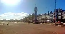 Weymouth's popularity, both as a trading port and as a holiday destination, also grew in this period and the arrival of the railway in 1857 boosted both industries.[9] The Royal National Lifeboat Institution stationed a lifeboat at Weymouth for the first time on 26 January 1869. A boathouse was built with a slipway by the harbour and is still in use, although the lifeboat is now moored at a pontoon.[22] In 1887, to mark the 50th year of Queen Victoria's reign, a multi-coloured Jubilee Clock was erected on the esplanade.[23]