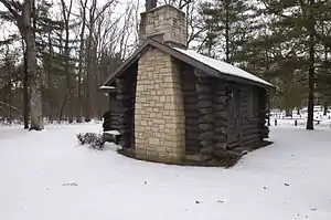 After the lodge was completed, it was decided to build a restaurant and breezeway onto the lodge building.[5] Logs for most of the project were shipped via railroad from as far away as Oregon and Washington state, unloaded in Stratford, Illinois and dragged to the construction site by teams of horses. The CCC project also completed sixteen[7] one-room log cabins and three four-bedroom cabins. The work crews also built picnic shelters, trail shelters, and foot bridges. Only the logs for the cabins came from another source.[5] They were purchased from a salvage company that had purchased utility poles from a defunct utility company at the price of 30 cents a piece.[5]