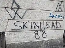White power skinheads, also known as racist skinheads and neo-Nazi skinheads, are members of a neo-Nazi, white supremacist and antisemitic offshoot of the skinhead subculture. Many of them are affiliated with white nationalist organizations and some of them are members of prison gangs.[1] The movement emerged in the United Kingdom between the late 1960s and the late 1970s, before spreading across Eurasia and North America in the 1980–1990s.