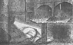 The common lodging-houses in and around Whitechapel provided cheap communal lodgings for the desperate, the destitute and the transient, among whom the Whitechapel murder victims were numbered.[6] The nightly price of a single bed was 4d (equivalent to £1.98 in 2021)[7] and the cost of sleeping upon a "lean-to" rope stretched across the bedrooms was 2d for adults or children.[8]