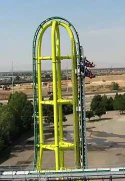 Wicked is located in the south midway of the park in an area previously used for parking.[3] It has a green track with mostly silver supports, the only exception being the bright yellow supports of the launch tower.