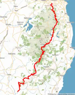 The Way ascends through a gap between Ballygobban and Shielstown Hills, yielding views stretching from Lugnaquilla to Keadeen Mountain and beyond to Eagle Hill and the Castlecomer Plateau.[102] The hills ahead mark the edge of the granite backbone of the Wicklow Mountains; in the distance they gradually merge with the Blackstairs Mountains, which can be seen on the skyline.[102] The trail follows the road passing close to the village of Moyne before joining a boreen.[103] Along this boreen are the remains of a holy well dedicated to Saint Colmcille.[103] The trail contours around Ballycumber Hill and then continues along the eastern slopes of Garryhoe Hill, passing the remains of a ringfort, approximately 15 metres (49 feet) in diameter.[104] Further along is a memorial to a Dr James McNamara who was killed in a shooting accident in 1916.[105] Passing through a series of gates along the way, the trail follows Coolafunshoge Lane, an old droving path with extensive views of south Wicklow.[106] The lane emerges onto the road, crossing a bridge over the River Derry to reach the R747 road close to Tinahely.[107]