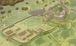 Wigmore Castle itself straddles the south-eastern edge of a spur, with marshland (since drained) to its north. The defences of the castle were further strengthened by the construction of ditches across the spur, between which the castle was built. These ditches acted as moats with the north-western one running past a mound, which was also fortified. This fortification was originally probably a wooden palisade, but later a stone keep was constructed in its place.