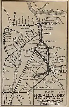 The Willamette Valley Southern Railway was a railroad in Oregon that ran from Portland, Oregon, where it connected to the trolley line, through Molalla, Oregon, where it connected to the Eastern & Western Logging Railroad as well as Southern Pacific, to Mt. Angel, Oregon.[1] The line was reorganized from the Clackamas Southern after facing financial troubles in 1915 and closed in 1933. Like many short lines of Oregon at the time, it ran off electricity from hydroelectric dams. For the last three years the line stopped just outside of Molalla. Only 400 feet of the railroad remains intact, nudged over a few feet from its original position of the Oregon Pacific Railroad.[2]
