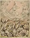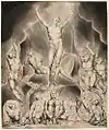There are twelve plates in each of the Paradise Lost sets, one for each of the books in the poem. While some of these, such as Satan, Sin and Death: Satan Comes to the Gates of Hell, depict specific scenes from the epic; others, such as Satan Watching the Endearments of Adam and Eve, are syntheses of several scenes.[1] In the latter case, Blake employed visual barriers to separate the elements from different scenes, such as the arc of the bower in Satan Watching the Endearments of Adam and Eve.[2]