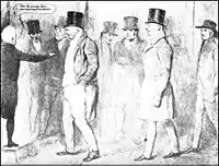 At this time the writings of William Cobbett suddenly became of great authority; they were read on nearly every cottage hearth in the manufacturing districts of South Lancashire, in those of Leicester, Derby, and Nottingham; also in many of the Scottish manufacturing towns. Their influence was speedily visible. He directed his readers to the true cause of their sufferings—misgovernment; and to its proper corrective—parliamentary reform.[68][69][70]