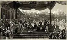 A sketch by F.C. Lewis showing The Durbar of His Highness the Maharaja of Travancore on 27 November 1851 with Cullen carrying a letter from Queen Victoria to the Maharaja of Travancore thanking the latter for his contributions to the Great Exhibition of 1851 which included the gift of a carved ivory chair