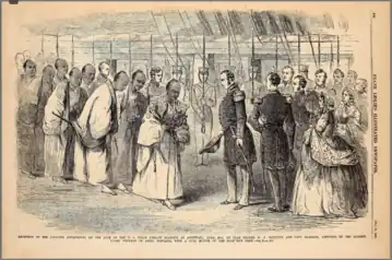 On 9 May, McCluney sent a complete list of the seventy-two-member Japanese delegation's full names and titles to the secretary in preparation for their arrival.[55] Immediately a pilot returned with orders to divert the Roanoke from New York to Hampton Roads. President James Buchanan had changed his mind. New York had appropriated $30,000 for the Japanese reception and newspapers were critical of Buchanan's last minute decision to receive the Japanese in Washington instead of New York.[56][57]