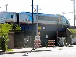 The Wilmington Rail Viaduct is a series of fills and bridges, about 4 miles (6.4 km) long, that carries the Northeast Corridor through the city of Wilmington, Delaware, above street level. Constructed between 1902 and 1908, the structure consists principally of fills supported by heavy stone retaining walls, punctuated with plate girder bridges over streets, and augmented by a few sections of brick arch viaduct. Its construction is typical of the Pennsylvania Railroad's architectural practices at the time, and the viaduct has been documented by the Historic American Engineering Record and listed on the National Register of Historic Places.[2] Built by the Pennsylvania Railroad (PRR) as part of a series of grade crossing eliminations along the Northeast Corridor, the elevation of the rail line necessitated several other changes to rail infrastructure in Wilmington, including the construction of the Wilmington Shops at the east end of the viaduct, and the construction of the Wilmington Station and adjacent Pennsylvania Railroad Office Building along the elevated right-of-way.