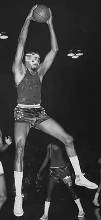 Chamberlain was the catalyst for several 1956 NCAA basketball rule changes, including the requirement for a shooter to keep both feet behind the line during a free-throw attempt.[30][lower-alpha 5] He had a 50-inch (130 cm) vertical leap,[32] and was capable of converting foul shots by dunking without a running start, beginning his movement just steps behind the top of the key.[33][lower-alpha 6] An inbounds pass over the backboard was banned because of Chamberlain.[35] Offensive goaltending, also called basket interference, was introduced as a rule in 1956 after Bill Russell had exploited it at San Francisco and Chamberlain was soon to enter college play.[36]