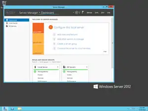 ![]() Screenshot of Windows Server 2012, showing the Server Manager application which is automatically opened when an administrator logs on, taskbar, and the blue color of Aero Lite | |