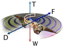 The WEAV uses a multitude of small electrodes covering the whole wetted area of the aircraft, in a multi-barrier plasma actuator (MBPA) arrangement, an enhancement over dual-electrode dielectric barrier discharge (DBD) systems using multiple layers of dielectric materials and powered electrodes.[11] These electrodes are very close to one another so surrounding air can be ionized using RF AC high voltage of a few tens of kilovolts even at the standard pressure of one atmosphere. The resultant plasma contains ions that are accelerated by the Coulomb force using electrohydrodynamics (EHD) at low altitude and small velocity. The surface of the vehicle acts as an electrostatic fluid accelerator pumping surrounding air as ion wind, radially then downward, so the lower pressure zone on the upper surface and the higher pressure zone underneath the aircraft produces lift and thrust for propulsion and stability.[1] At a higher altitude and to reach greater speeds, a magnetic field is also applied to enhance collisions between electrons and heavy species in the plasma and use the more powerful Lorentz body force to accelerate all charge carriers in the same direction along a radial high speed jet.[2] A very early version of this documented by Jean-Louis Naudin used wire originally from a hard disk drive cable (aka 80/40 wire) with alternate HV on each pair and this works but is very inefficient compared to newer approaches as discussed above.