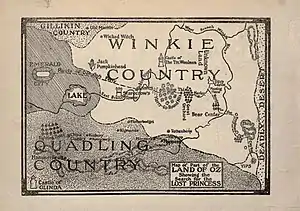 ![]() Official Map of Oz, with Winkie Country shown in the East due to a reversed image | |