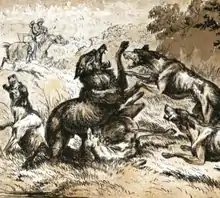 Wolves were hunted in both Czarist and Soviet Russia with borzoi by landowners and Cossacks.[7] Covers were drawn by sending mounted men through a wood with a number of dogs of various breeds,[8] including deerhounds, staghounds and Siberian wolfhounds, as well as smaller greyhounds and foxhounds,[2] as they made more noise than borzoi.[8] A beater, holding up to six dogs by leash, would enter a wooded area where wolves would have been previously sighted.[2] Other hunters on horseback would select a place in the open where the wolf or wolves may break. Each hunter held one or two borzois, which would be slipped the moment the wolf takes flight.[8] Once the beater sighted a wolf, he would shout "Loup! Loup! Loup!" and slip the dogs. The idea was to trap the wolf between the pursuing dogs and the hunters on horseback outside the wood.[2] The borzois would pursue the wolf along with the horsemen and yapping curs. Once the wolf was caught by the borzois, the foremost rider would dismount and quickly dispatch the wolf with a knife. Occasionally, wolves are captured alive in order to better train borzoi pups.[8]