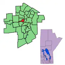Wolseley is bordered to the east by Fort Rouge, to the south by River Heights, to the north by Minto, and to the west by St. James. The University of Winnipeg is located in the northeast corner of the riding. The Legislative Assembly of Manitoba is located at the meeting point of Wolseley and Fort Rouge.