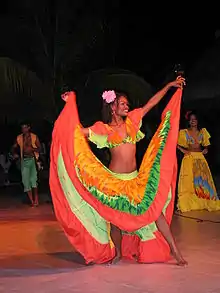 Two female Sega music dancers (center and right) from Mauritius.