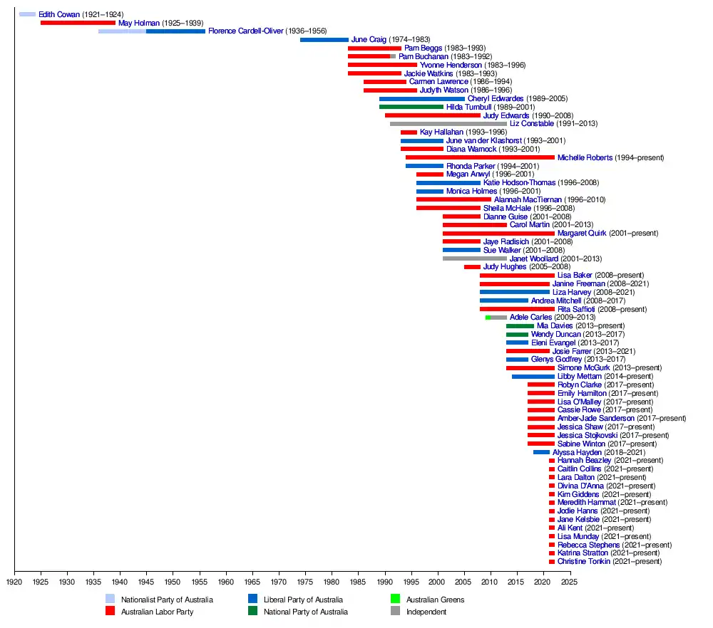 The first successful female candidate for the Legislative Assembly was Edith Cowan, who was elected as the member for West Perth in 1921 representing the Nationalist Party of Australia. This was the first time a woman had won election anywhere in Australia. Cowan was defeated in 1924 but in 1925 May Holman was elected to the seat of Forrest in a by-election, becoming the first successful Labor woman in Australia. Holman was joined by Florence Cardell-Oliver of the Nationalist Party in 1936, who would become the first female cabinet minister. Cardell-Oliver's retirement in 1956 led to a period of absence for women, until June Craig of the Liberal Party was elected in 1974, since which time women have been continuously represented in the Assembly.