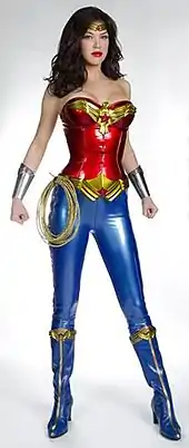 Reports surfaced in October 2010 that Warner Bros. Television was teaming with writer-producer David E. Kelley to pitch a new Wonder Woman television series to networks.[6] The major networks all turned down the series,[7] but NBC, the final network to initially pass on the project, ordered a pilot in January 2011. Jeffrey Reiner was hired to direct the pilot the following month.[8] The same month, Adrianne Palicki was selected to play the title role.[9] Lynette Rice of Entertainment Weekly commented that compared to Lynda Carter's costume, Palicki's costume de-emphasized patriotism and played up the character's Greek mythological origin.[10] Lynda Carter herself said Palicki looked gorgeous.[11] Kyle Buchanan of New York said that the costume "looked less like a superhero outfit and more like a Project Runway challenge gone awry, the kind of thing Nina Garcia would dismiss by sniffing, 'Shiny, cheap, and tacky'".[12] Borys Kit of The Hollywood Reporter pointed out that the costume was causing a divide, with many exclaiming it was "too trashy and too bad porn-y".[13] After the first official images of Palicki in costume were revealed, Fox News republished a story criticizing the loss of Wonder Woman's American symbolism.[14] Warner Bros. later changed the costume, replacing the blue boots and rubbery pants, due to fan criticism,[15] but in the episode "Gorilla My Dreams" of Kelley's show Harry's Law, Erica Durance (best known as Lois Lane from the television series Smallville) as Annie Bilson, wears the original costume now with red boots.[16][17]