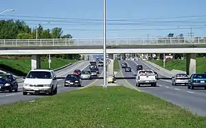 Woodroffe Avenue has a few unusual features. First, it changes alignment significantly at Carling Avenue, requiring a couple of turns. Second, the middle section south of Baseline Road includes dedicated bus lanes as it incorporates the Southwest Transitway. Finally, south of Hunt Club Road, it was quite narrow and very congested as it was a two-lane rural road heading towards Barrhaven. However, the road was recently widened to four lanes to improve traffic flow between Hunt Club Road and Fallowfield Road. A new section of the Transitway was recently built alongside this road.[1]