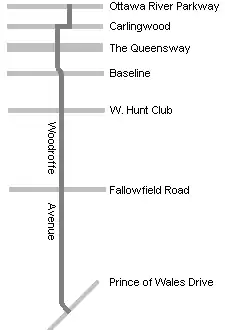 Woodroffe Avenue (Ottawa Road #15) is a major north-south arterial road in Ottawa, Ontario, Canada's west end. It runs south from the Kichi Zibi Mikan through Baseline Road and Barrhaven to just short of Prince of Wales Drive near Manotick. The road runs through the heart of Nepean in Ottawa's west end. A satellite Via Rail station (Fallowfield station) is also located at the intersection of Fallowfield Road.