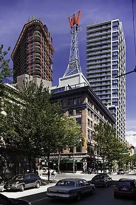 In 1944, the landmark "W" was installed on the top of the building on a 25-metre replica of the Eiffel Tower, replacing a pre-war searchlight beacon which had until then been the building's hallmark. The beacon, which was visible at night from as far away as Abbotsford and Mission, was shut down at the beginning of World War II because of its potential use as a landmark for aerial attacks.
