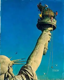 The painting was created for the cover of an edition of The Saturday Evening Post, published on 6 July 1946,[2] from sketches that Rockwell made in March 1946. It depicts the cleaning of the amber-coloured glass of the torch, an operation undertaken annually each July.[3] Rockwell focuses on just a small part of the Statue of Liberty – the torch, a 42 feet (13 m) long arm, and part of the head of the colossal statue, silhouetted against a clear summer blue sky. Five workmen are attached to the statue by ropes, including one who is a caricature of Rockwell himself, and one African-American in a red shirt. The inclusion of a non-white figure working with whites, apparently only noticed in 2011,[3] contravened a Saturday Evening Post policy of only showing people of ethnicity in subservient roles.[4]