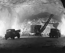 The principal tunnelling method used during the war was the blast-hole diamond drilling technique, which had only recently been developed. It involved either undercutting the tunnel and bringing down the back using diamond drill blasting – detonating gelignite charges in drill holes spaced between 2.1 metres (6 ft 11 in) to 2.4 metres (7 ft 10 in) apart – or excavating the central portion of the tunnel to its full height and diamond drill blasting the sides.[15] The resulting rubble was used to extend the airfield at RAF North Front out into the Bay of Gibraltar.[16]