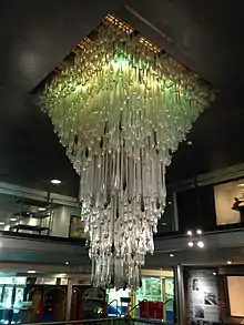 Since 2008 the World of Glass has been home to one of four chandeliers, restored by David Malik & Son, which originally hung in the main hall of Manchester Airport.[17] With 1,300 clear, smoked grey and amethyst lead glass droplets, individually blown by master craftsman Bruno Zanetti and weighing a staggering two tons, each chandelier was commissioned at a cost of £3,000 in the 1960s but would now cost more than £250,000.[18]