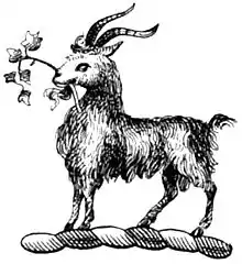 Dating from the 15th century, the Worthington coat of arms is argent, three dung forks sable.[8] The arms can be considered a rebus, “worthing” being an archaic slang term for dung. The crest is a goat statant argent, holding in the mouth an oak branch vert, fructed or; the motto, "Virtute Dignus Avorum" (in virtue worthy of ones ancestors).[9] The motto and coat of arms may be seen in Chorley Church, Winslow Parish, Cheshire, England.[10][11]