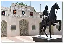 Chetak, traditionally the horse ridden by Maharana Pratap at the Battle of Haldighati is associated with Rajput chivalry and is symbolic of mobility and manoeuvre. Th horse is poised in a bid to spring into action, which symbolises optimum readiness. The torso of a soldier is depicted in a power packed stance launching a spear at the enemy - which symbolises instant alertness for aggressive action to face any challenge.[8]