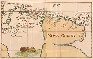 After the unsuccessful attempt of Bernardo de la Torre in 1543 to return to Mexico along a northern route, López de Villalobos commissioned Ortiz de Retez for the same mission but going south. On 16 May, 1545, Ortiz de Retez, in command of the San Juan de Letrán, left port in Tidore, an island which was Spain's stronghold in the Maluku Islands and going by way of the Talaud Islands and the Schoutens, reached the northern coast of New Guinea, which was coasted till the end of August when, having got to the 5° S. latitude, contrary winds and currents forced a return to Tidore where he arrived on 5 October, 1545. Many islands were encountered and first charted, along the northern coast of New Guinea, and in the Padaidos, Le Maires, Ninigos, Kaniets and Hermits, to some of which Spanish names were given.[2][3][4]