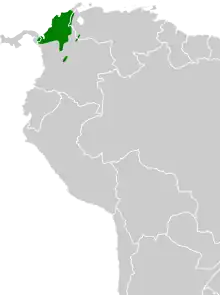 It is found in Colombia and adjacent areas of Panama and Venezuela. Its natural habitats are subtropical or tropical moist lowland forests and subtropical or tropical moist montane forests.