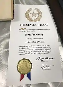 The Commission of the Yellow Rose of Texas, commonly referred to as the Yellow Rose of Texas, is an honorary commission conferred by the Governor of Texas to Texas women for exceptional community service.