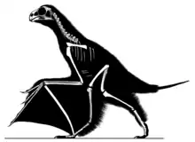 Small patches of wrinkled skin were also preserved, between the fingers and the styliform bone, indicating that unlike all other known dinosaurs, the planes of Yi qi were formed by a skin membrane rather than flight feathers.[1] The membrane stretched between the shorter fingers, the elongated third finger, the styliform bone, and possibly connected to the torso, though the inner part of the wing membrane was not preserved in the only known fossil.[1] This would have given the animal an appearance similar to modern bats, in an example of convergent evolution.[1][2] However, in bats, the membrane stretches between the fingers only, no styliform wrist bone being present. Ossified styliform bones are found, however, in the wings of some modern gliding animals like flying squirrels. The greater glider, and the prehistoric gliding rodent Eomys quercyi, also have a similarly long cartilaginous styliform element.[1]