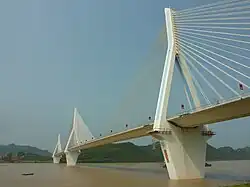 The Yiling Yangtze River Bridge (Chinese: 夷陵长江大桥) is a cable-stayed bridge over the Yangtze River in the city-center of Yichang, Hubei. It has 3 towers and two main spans, with a total of 4 spans including the side spans. It is a road bridge which carries four lanes of roadway and has a toll booth at one end. The bridge has a singular cable tension system, which carries the deck from the center. The Bridge crosses the Yangtze River, near Dagongqiao in Yichang. The main spans are 346 meters each. At the end of the bridge, to the south there is a cloverleaf interchange after the toll booth which is and exchange for the road.