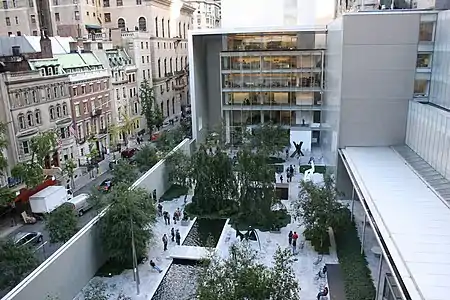 In 1997, Taniguchi won a competition to redesign the Museum of Modern Art, beating out nine other internationally renowned architects, including Rem Koolhaas, Bernard Tschumi, and Jacques Herzog and Pierre de Meuron.[5] The MoMA commission was Taniguchi's first work outside Japan. Writing in the Los Angeles Times, Suzanne Muchnic highlighted Taniguchi's "ability to create beautiful spaces that function effectively," in this case enabling museumgoers to find their bearings in a building whose sheer size and labyrinthine galleries and hallways can be disorienting. "The streamlined lobby has entrances at both ends, while the central atrium — or 'light garden,' as Taniguchi prefers — provides glimpses of upper floors," she writes. "Off to one side, the garden and a stairway are immediately apparent. On upper floors, bridges connect old and new parts of the building. Glass barriers around the atrium provide dramatic views within the museum. ... 'I wanted to direct people visually, not with signs,' says Taniguchi, who cuts openings in walls to show their thickness and to expose what lies behind them. 'In big European museums it is easy to get lost,' he says. 'You get tired visually and physically. In this museum, I intentionally created places where people can locate themselves. This is a modern way of thinking — expressing function, not hiding.'"[6]
