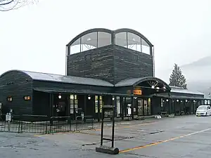 The station building was completed in 1990. It was designed by Arata Isozaki, an architect from Oita Prefecture, and is inspired by a chapel. It has a wooden, black-painted exterior, with a 12 meter high open concourse in the center, and an adjacent waiting room that doubles as an event hall. The concourse and platform can be separated by large, thick glass doors to prevent wind, and the waiting room has floor heating equipment that uses hot spring water.[2]